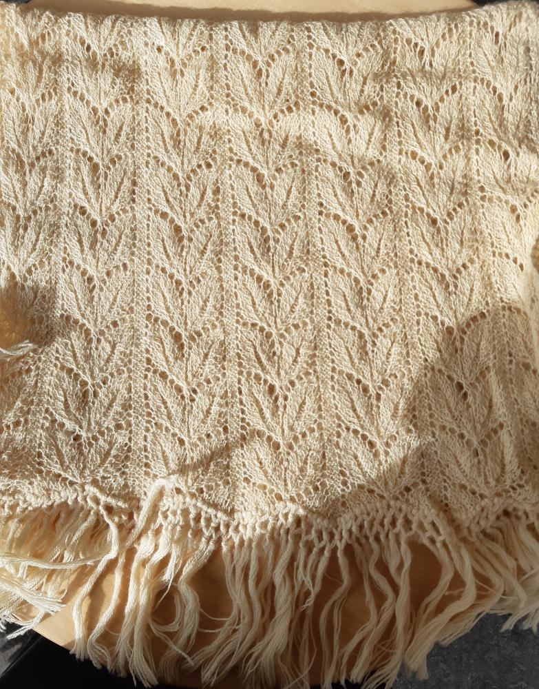 Saga: Björg Benediktsdóttir (1894-1991) Efri-Lækjadal prjónaði sjalið og gaf Guðrúnu Hólmfríði Sigurðardóttur það árið 1957.