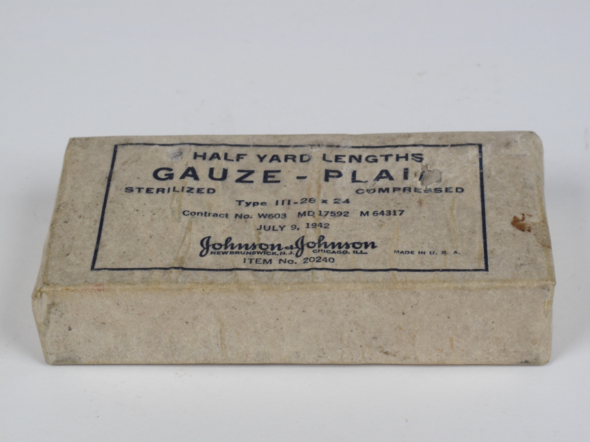Sjá NS-4522. Ljós grisjupakki með blárri áletrun. Þar segir meðal annars: Half Yard Lengths Gauze-Plain Sterilized Compressed Type III- 28 x 24. Óopnaður.