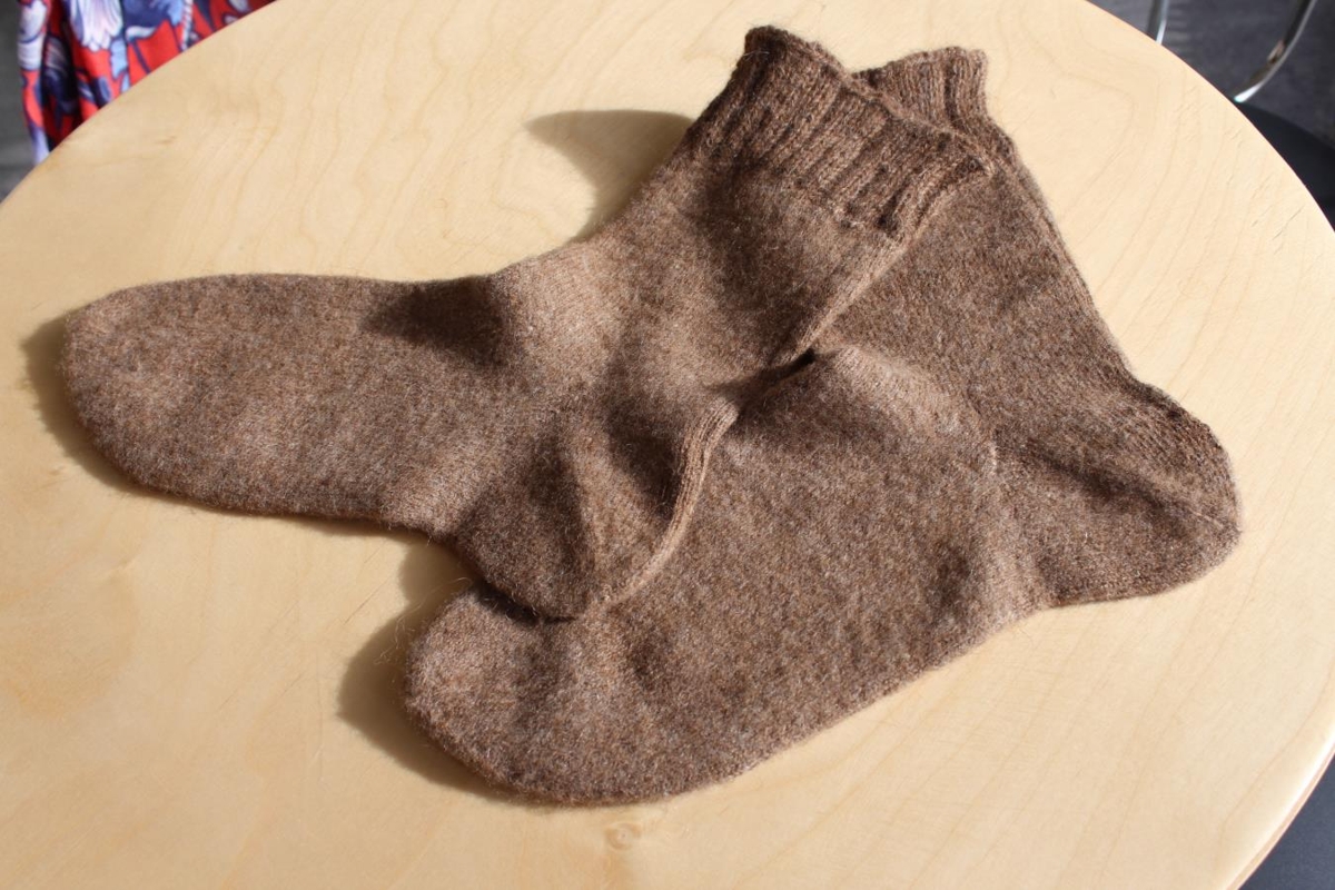 Sokkar - Mórauðir þelsokkar, vélprjónaðir nema stroff sem er handprjónað úr lopa.