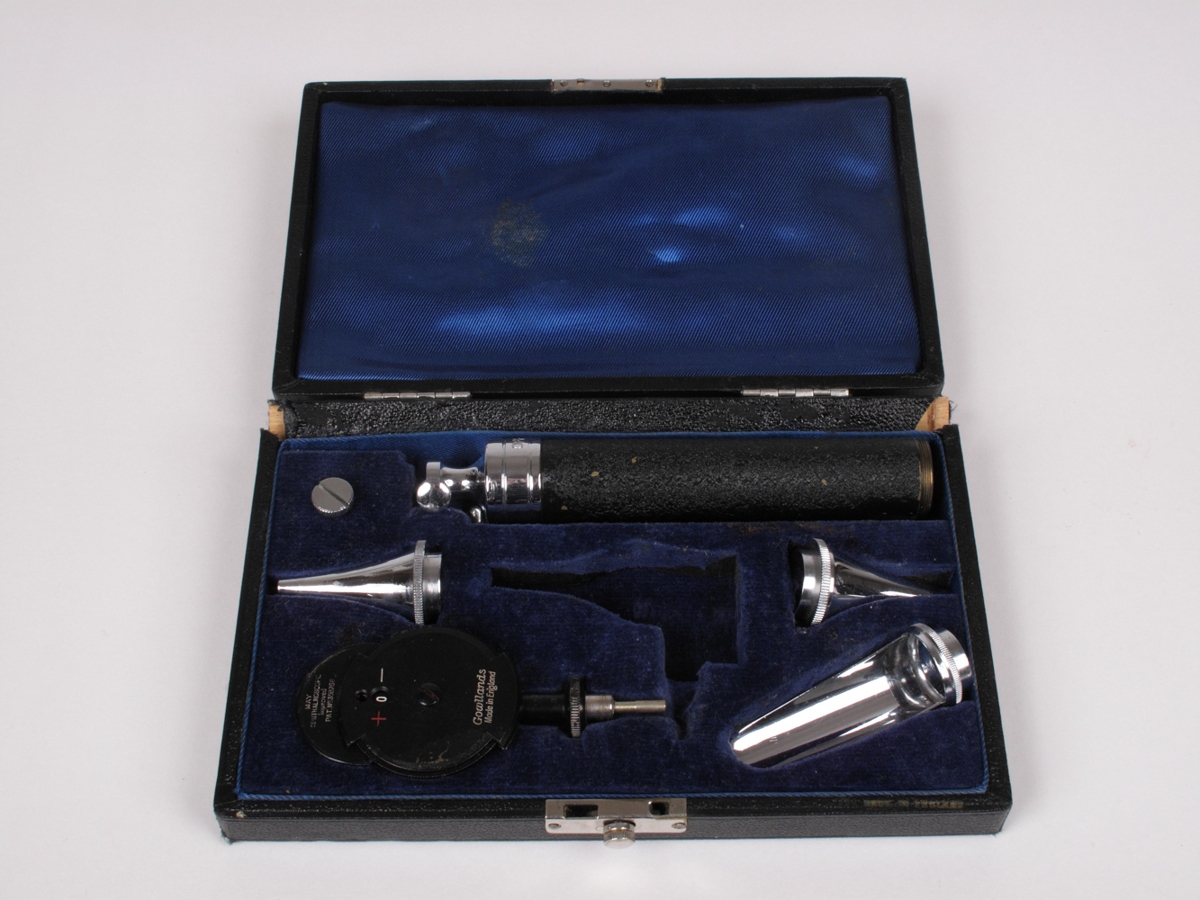 Augnspegillinn kemur í svörtum kassa, fóðruðum að innan. Í kassanum er handfang og fylgihlutir á það, svo sem pera, einhverskonar mæliskífa og spegill.