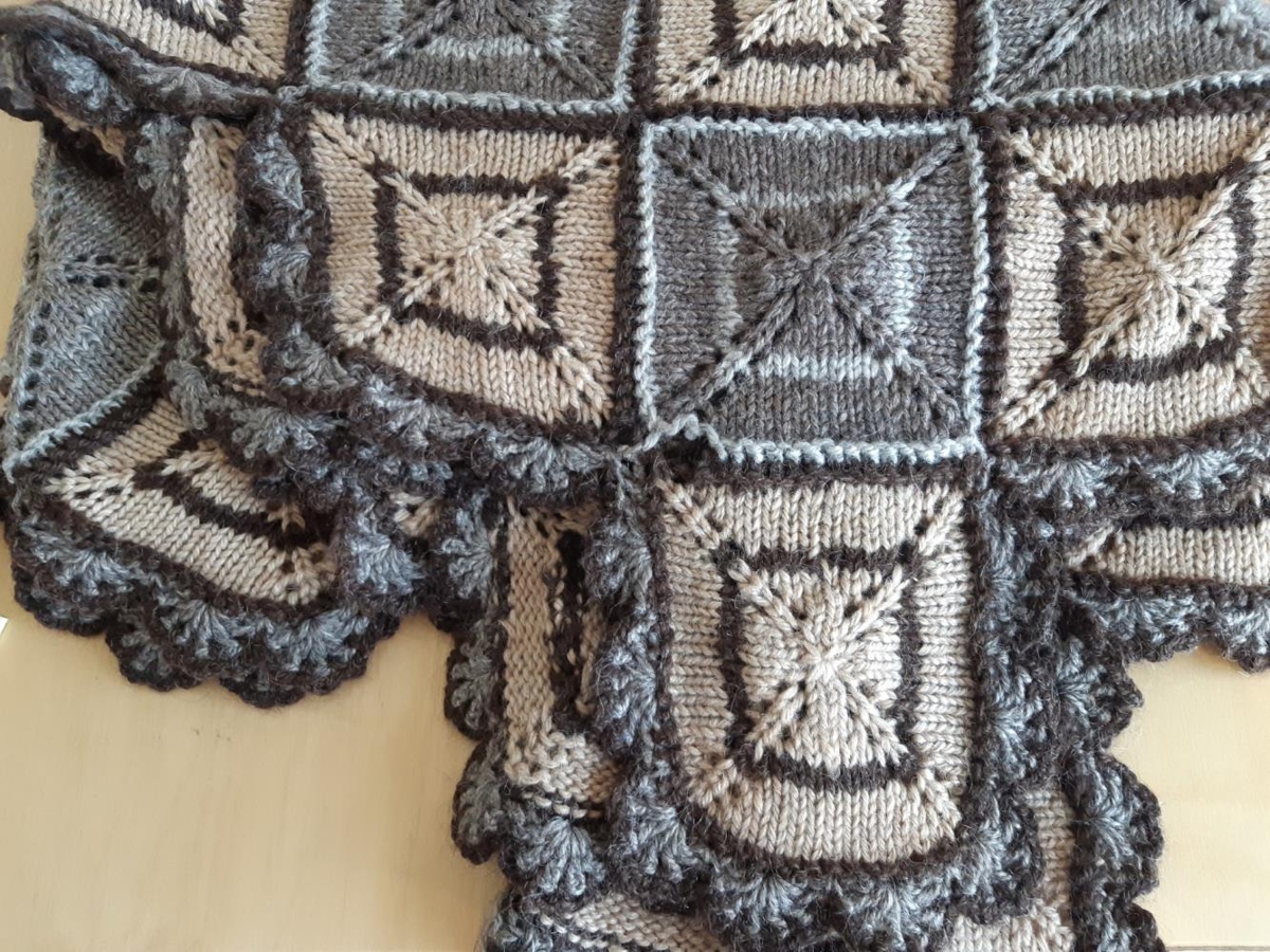 Lopateppi í fjórum litum með heklaðri blúndu utan um. Í teppinu eru tveir gráir litir og tveir drapplitir.