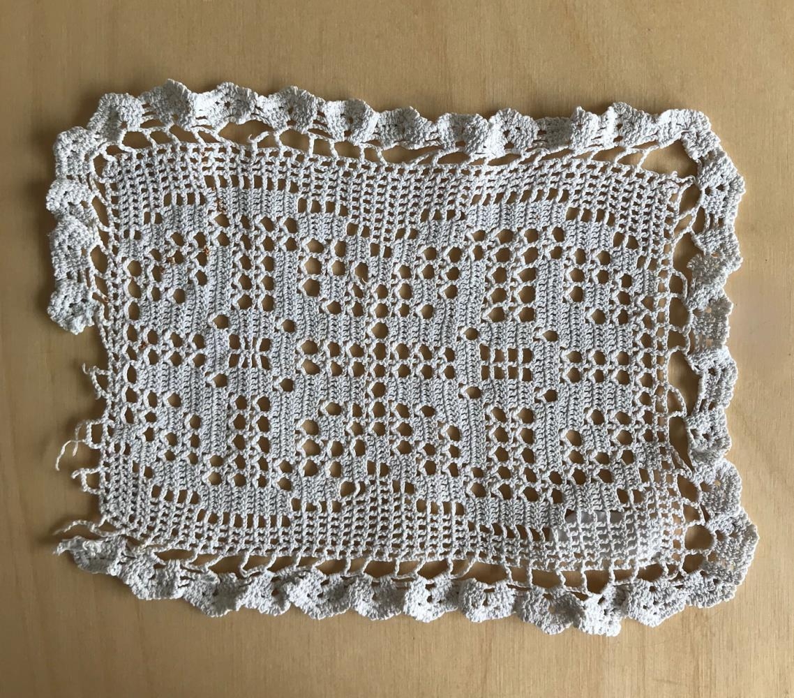 Dúkur - Heklaður dúkur úr hvítu bómullargarni. - Saga: Úr eigu Guðrúnar Brynjólfsdóttur frá Kleppsstöðum. Gefandi Vigdís frá Tjörn á Vatnsnesi Guðrún Brynjólfsdóttir (1890-1987)