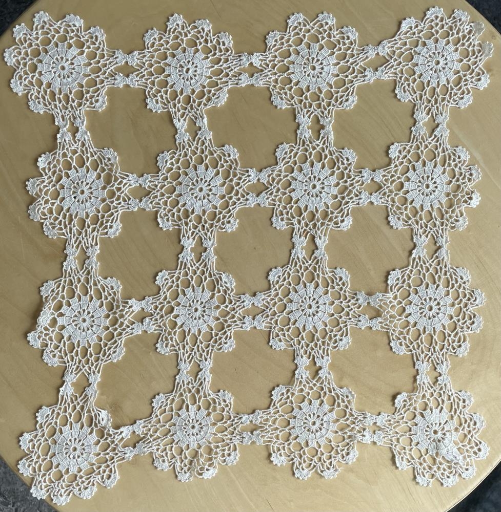 Heklaður dúkur úr 4 sinnum 4 dúllum með eyðum á milli. Unnið úr hvítu bómullargarni.