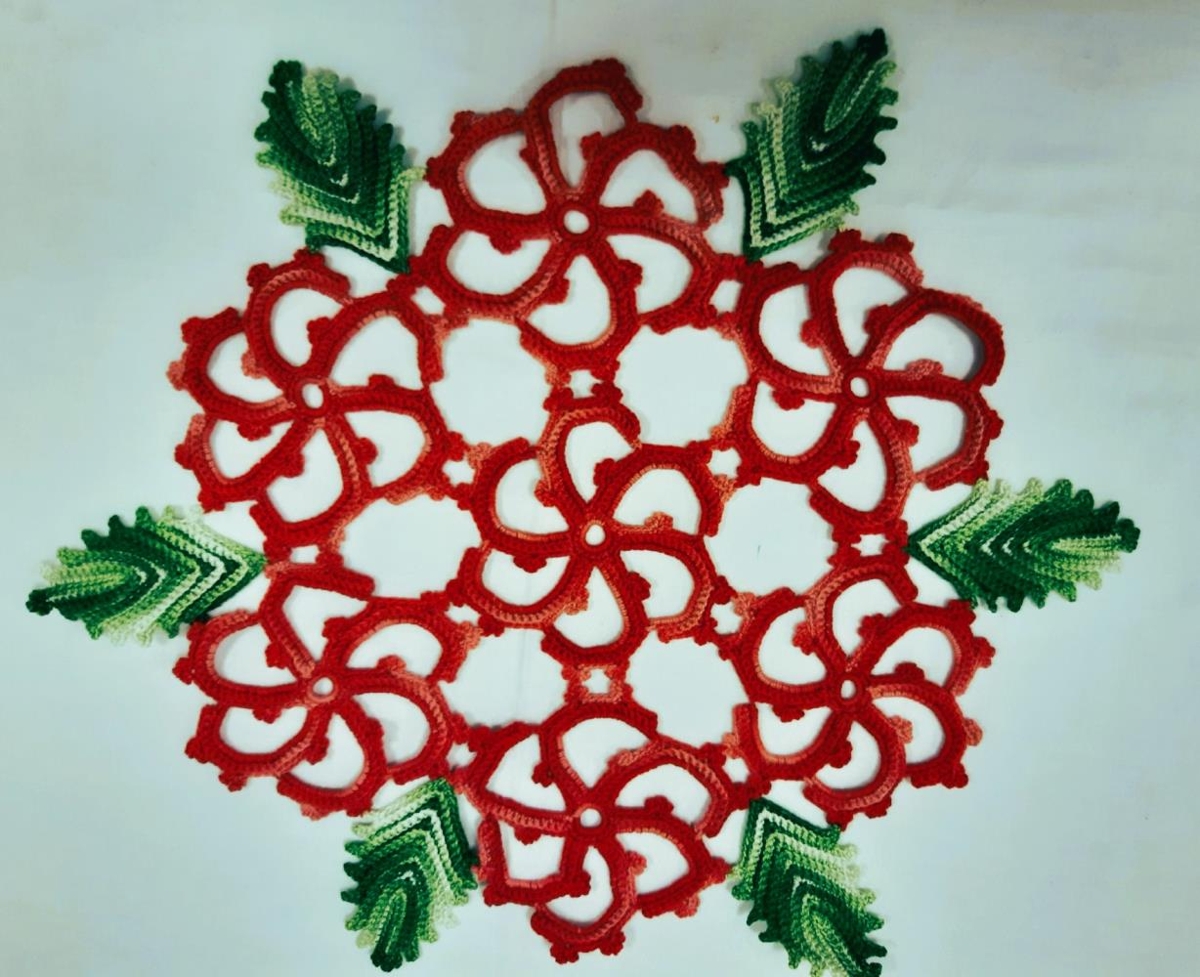 Dúkur úr reyrðu bómullargarni. Heklaður snúningshringur í miðju og 6 utan um. Allir hringir eru úr rauðu. Laufblöð eru græn.