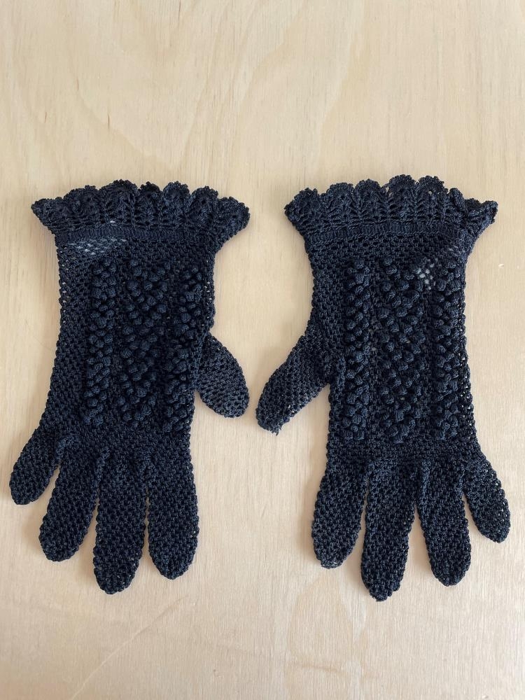 Hanskar - A og B. Svartir, heklaðir peysufatahanskar. Fingrahanskar. Hnútamunstur á handarbaki. Við úlnlið er 3 cm hekluð blúnda.