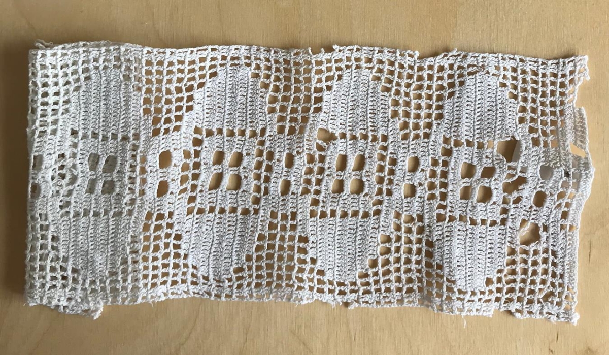 Milliverk, bútur - Milliverk heklað með pinnahekli, bútur. - Saga: Guðlaug heklaði milliverkið um 1940. Guðlaug var dóttir Björns Leví símstjóra á Blönduósi og konu hans. Björn var bróðir Guðmundar á Torfalæk