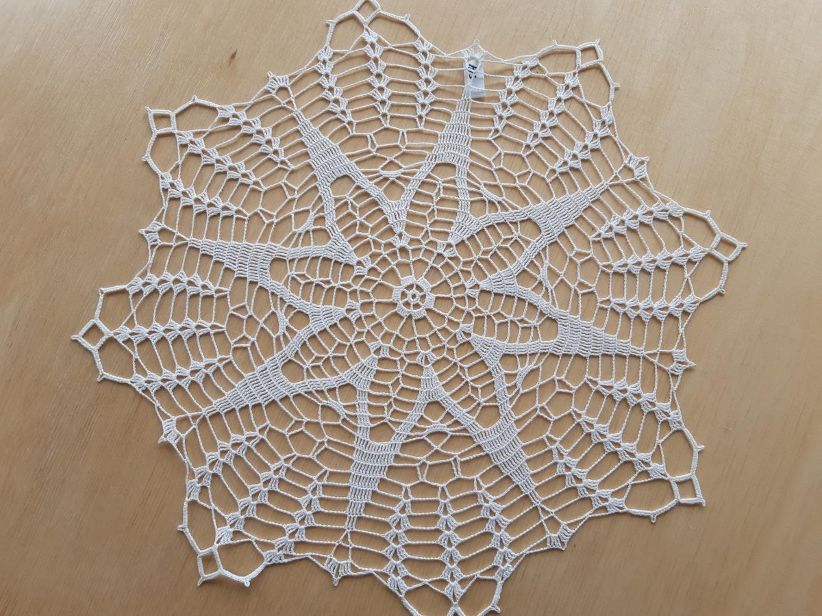Dúkur, heklaður úr hvítu fínu heklugarni mjög gisið munstur með stjörnu.