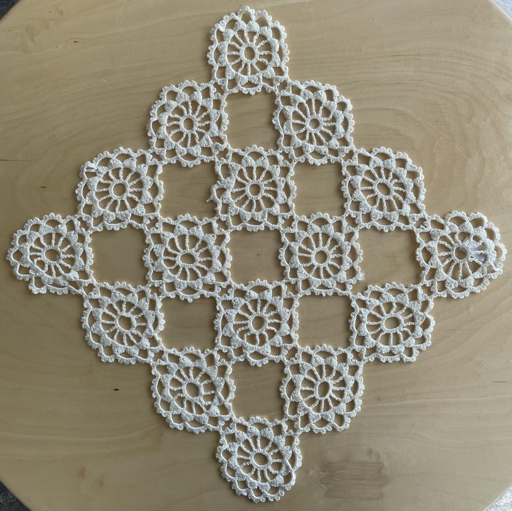 Hvítur dúkur heklaður úr heklugarni. Sextán dúllur heklaðar saman.