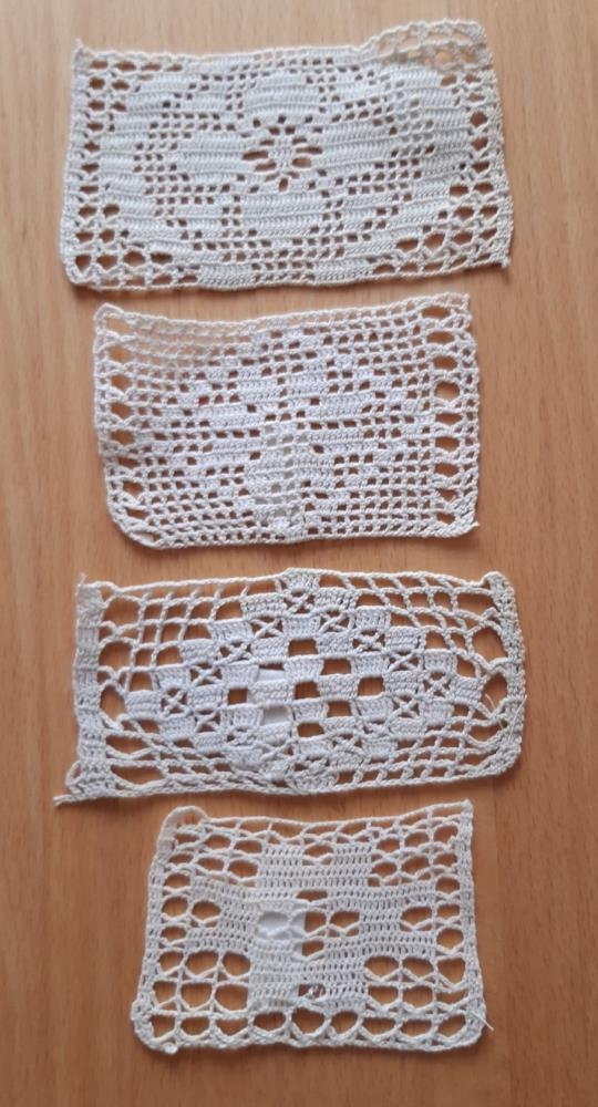 Prufur a,b,c,d. Fjögur mismunandi heklumunstur með pinnahekli.
