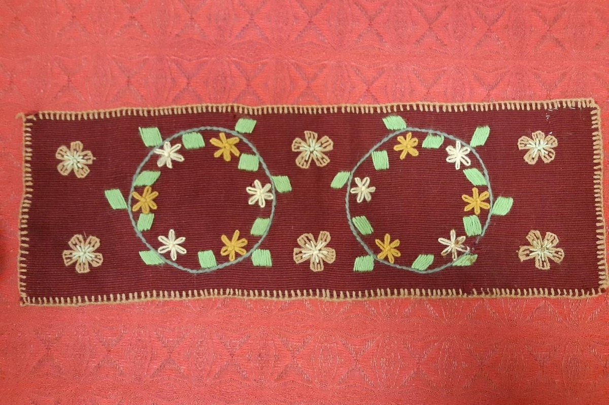 Dúkur, renningur saumaður á vínrautt efni með ullargarni. Flatsaumur, kontorstingur, lykkjuspor og hann er kappmellaður utan með. Litirnir eru grænn, gulur, grár og tveir drapplitaðir.