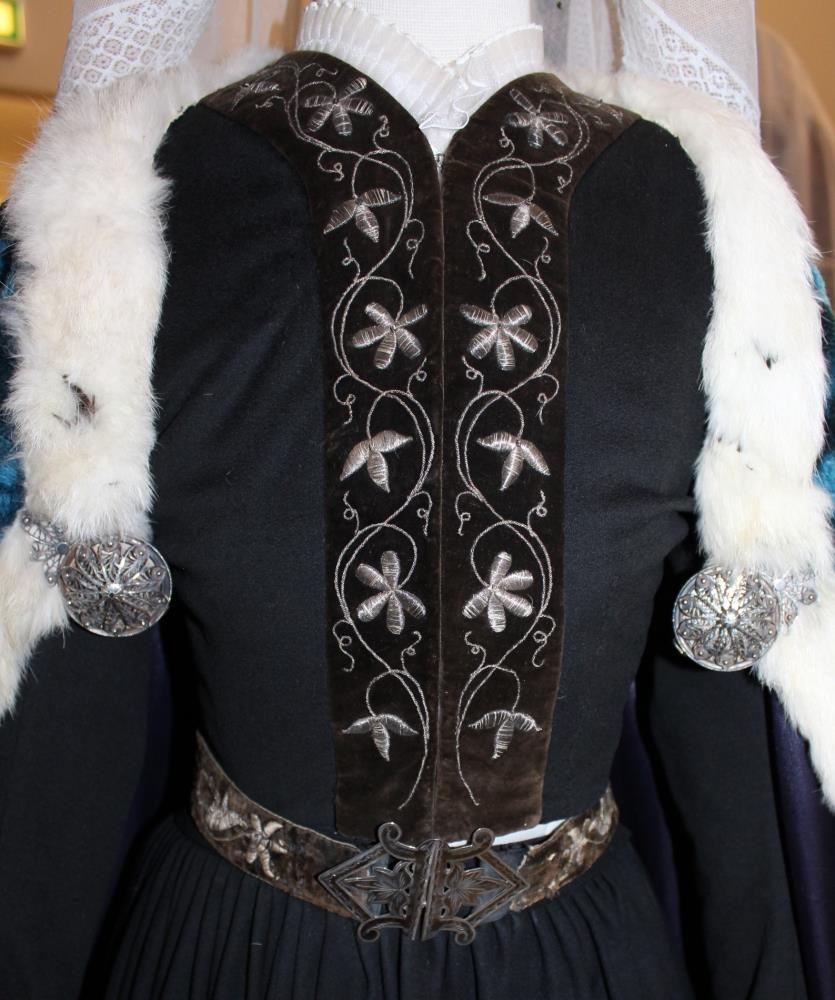 Treyja - Baldýruð treyja. Framan á eru borðar balderaðar á flauel. Á ermum eru baldýraðir flauelsborðar. Tvö blóm og lauf. Framan á er þrædd hvít blúnda. Yfir handveg, aftan á öxlum og á baki eru kniplaðir takkar. - Saga: Treyjuna átti Elínborg Guðmundsdóttir móðuramma Þorbjargar Jónasdóttur.