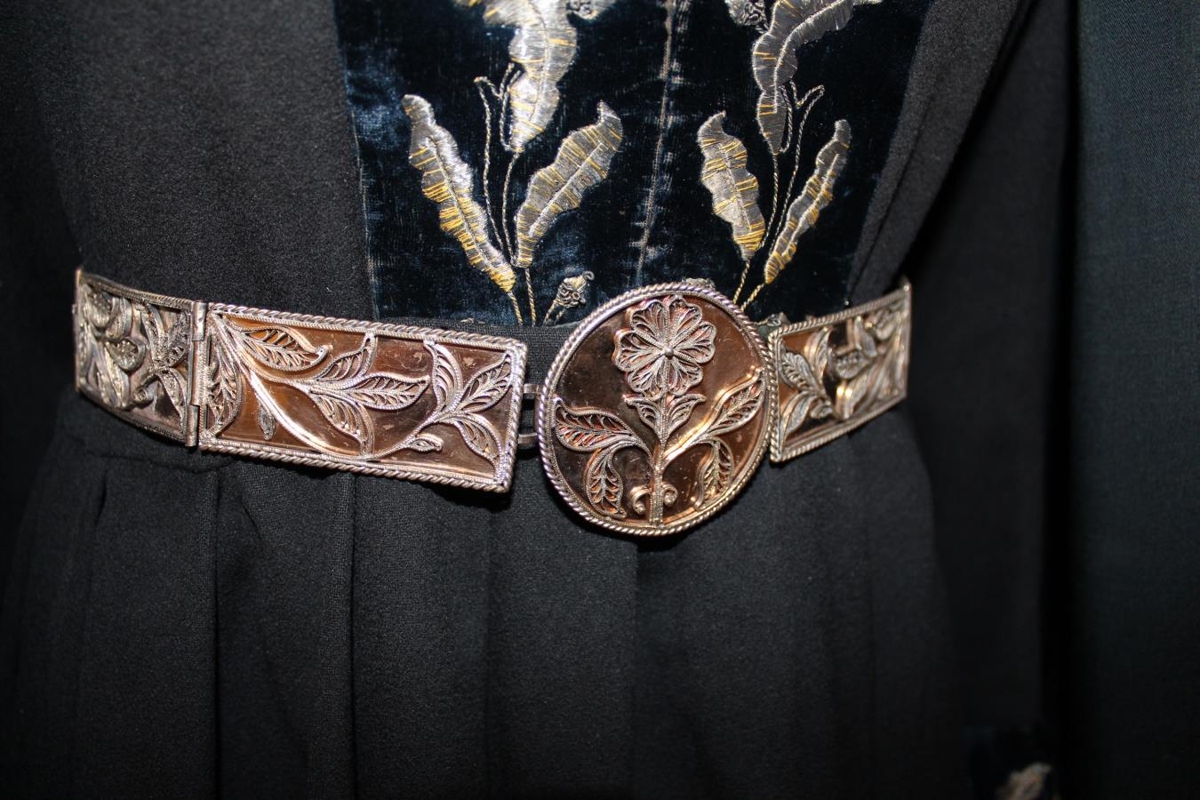 E) Sokkabelti og næla eru í sama stíl, aflöng og köntuð. Framan á beltinu er skjöldur. Stookarnir eru tíu talsins. Nælan og stokkarnir eru 7 x 3 cm að stærð. Hvort tveggja silfurplötur með víravirkislaufi ofan á.