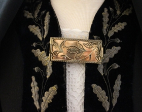 G) Treyja úr svörtu klæði. Flauelsborðar í baki, á öxlum og í hanvegi. Þeir eru með grönnum gylltum kniplingum. Hálsmál og boðungar baldýraðir með gylltum þræði á blásvart flauel. Treyjan er 44 cm síð.