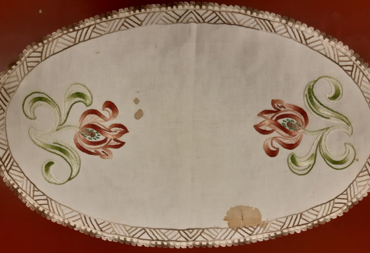 Sporöskjulaga útsaumaður dúkur.
