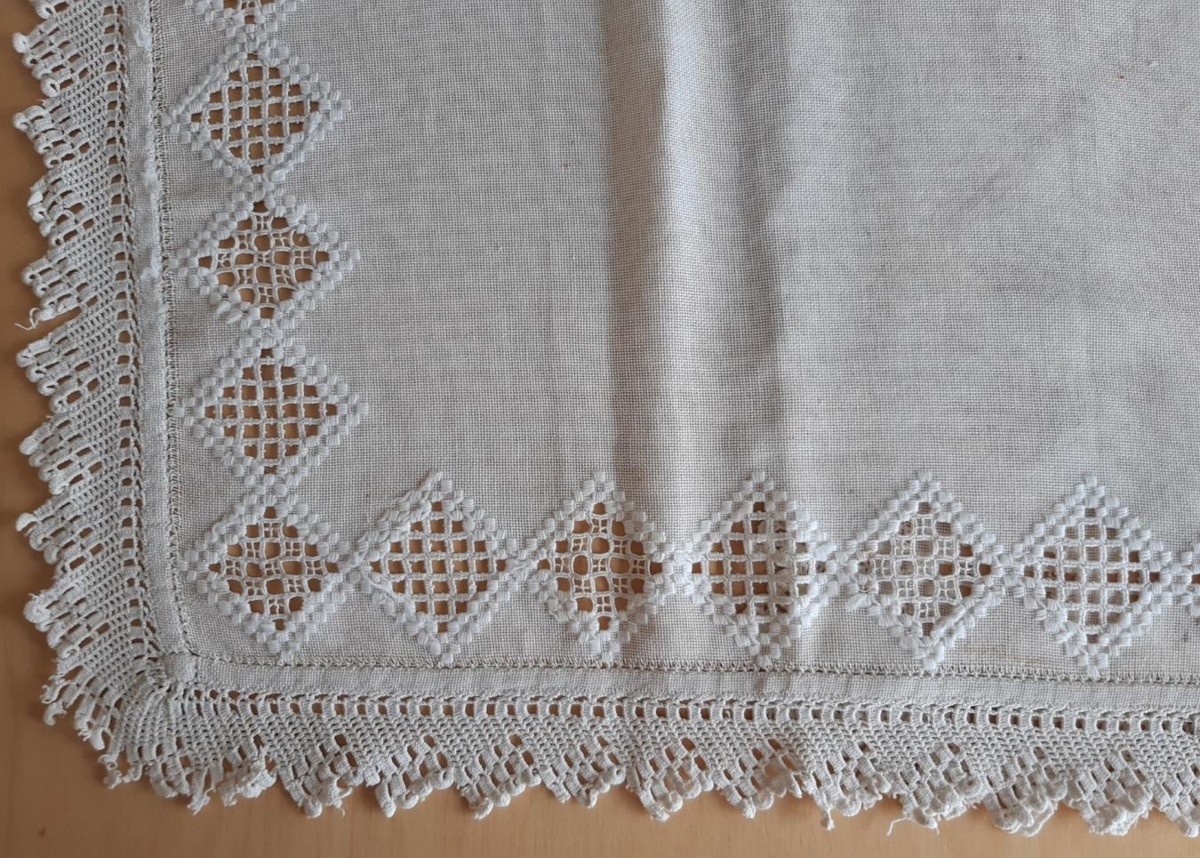 Kommóðudúkur saumaður með harðangri og klaustri í hvítan jafa. Utan með er hvít blúnda hekluð með pinna- og fastahekli.