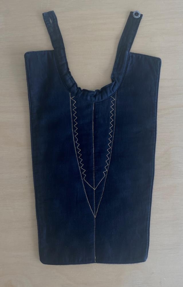 Brjósthlíf úr svörtu lasting efni fóðrað með brúnu vaðmáli. Útsaumað með aftursting. Garnið er gult. Listi í hálsmáli hnepptur aftur fyrir með járntölu.