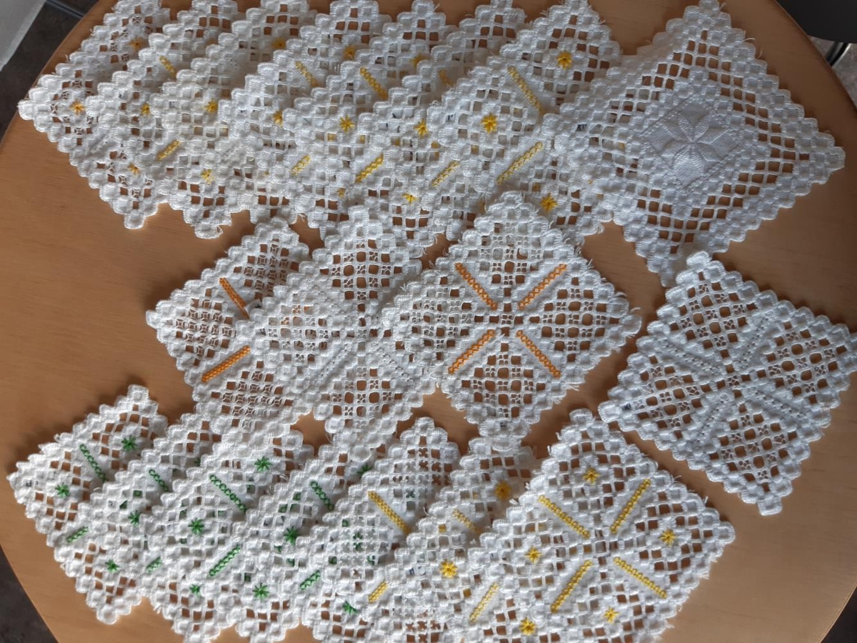 Diskamottur, 19 stykki. Saumaðar með harðangri og klaustri. 16 stk eru skreytt með öðrum lit en hvítum (10 stk með gulum, 2 með appelsínugulum og 4 með grænum). Öll 19 stk eru merkt a,b,c,d,e,f,g,h,i,j,k,l,m,n,o,p,q,r,s.