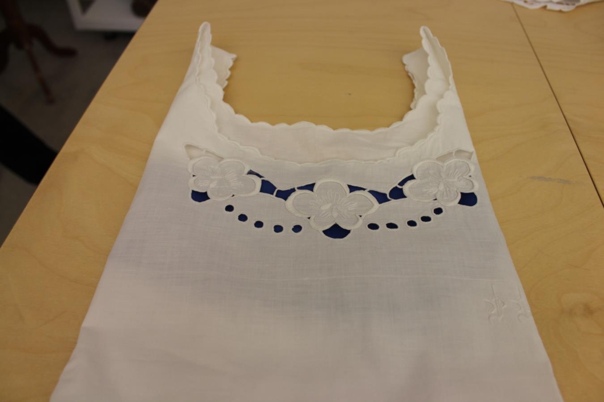 Undirkjóll - Léreftsundirkjóll, tungusaumur í handvegi og hálsmáli. Þrjú blóm eru kappmelluð á brjósti ásamt venesíönskum og enskum saumi. Stafirnir Þ.Þ. - Saga: Eigandi kjólsins var Þóra Þorsteinsdóttir f. 1908. Þóra var systir Guðmundar á Syðri-Grund. Gefandinn Guðrún Sigurjónsdóttir var fyrrum húsfreyja á Syðri-Grund, nú búsett á Hnitbjörgum á Blönduósi.