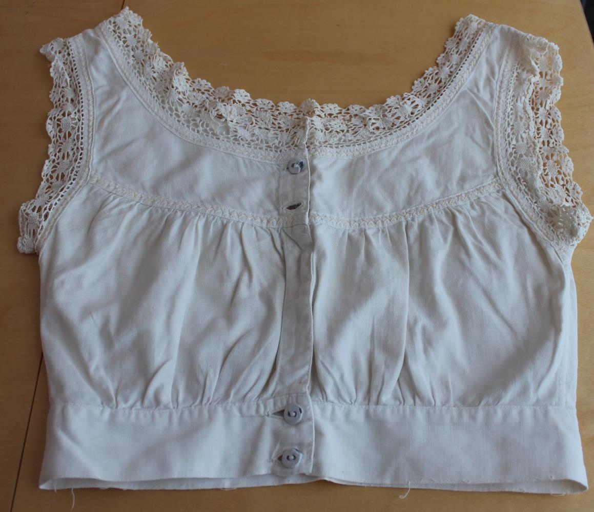 Kvenbolur saumaður úr hvítu léreft. Rykktur undir hlýrana og í mittinu. Á saumum er heksestingur. Í hálsmáli og handvegi er hekluð blúnda. Bolurinn er hnepptur að framan með hvítum léreftstölum.