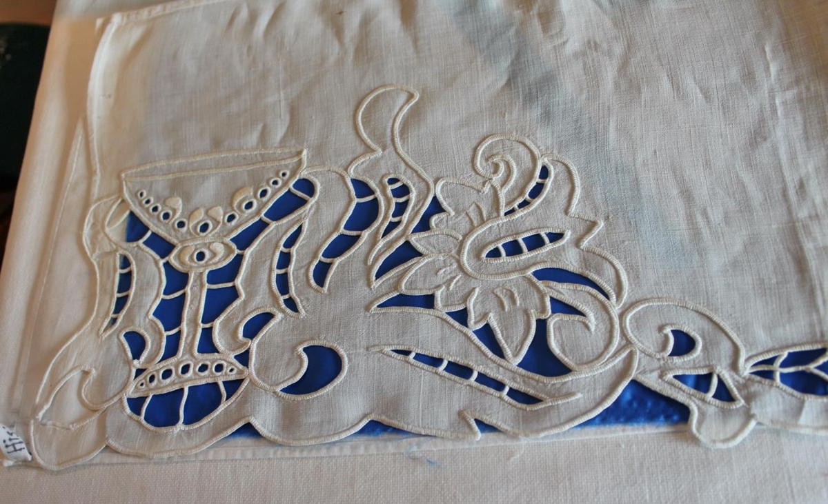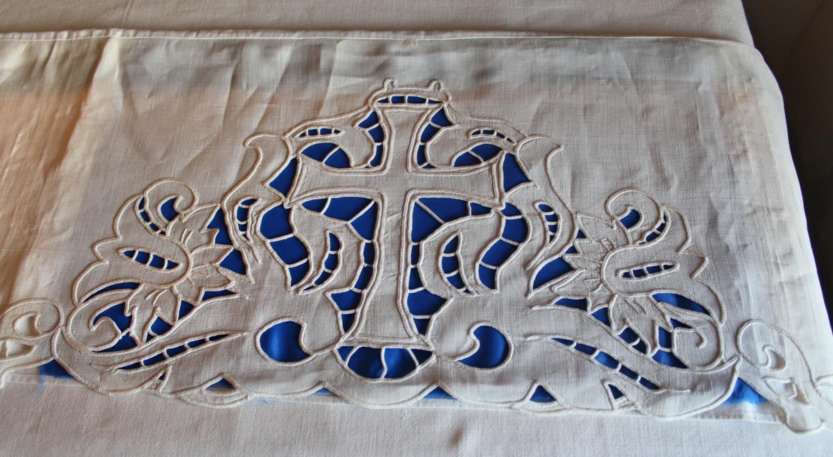 Altarisdúkur - Altarisdúkur saumaður með Feneyjasaumi (Venesíönskum) í hvítt léreft. Fyrir miðju er kross og í hornum sitthvoru megin við krossinn eru kaleikar. Dúkurinn er slitinn á hornunum. Hann er saumaðir saman úr tveimur efnum.
