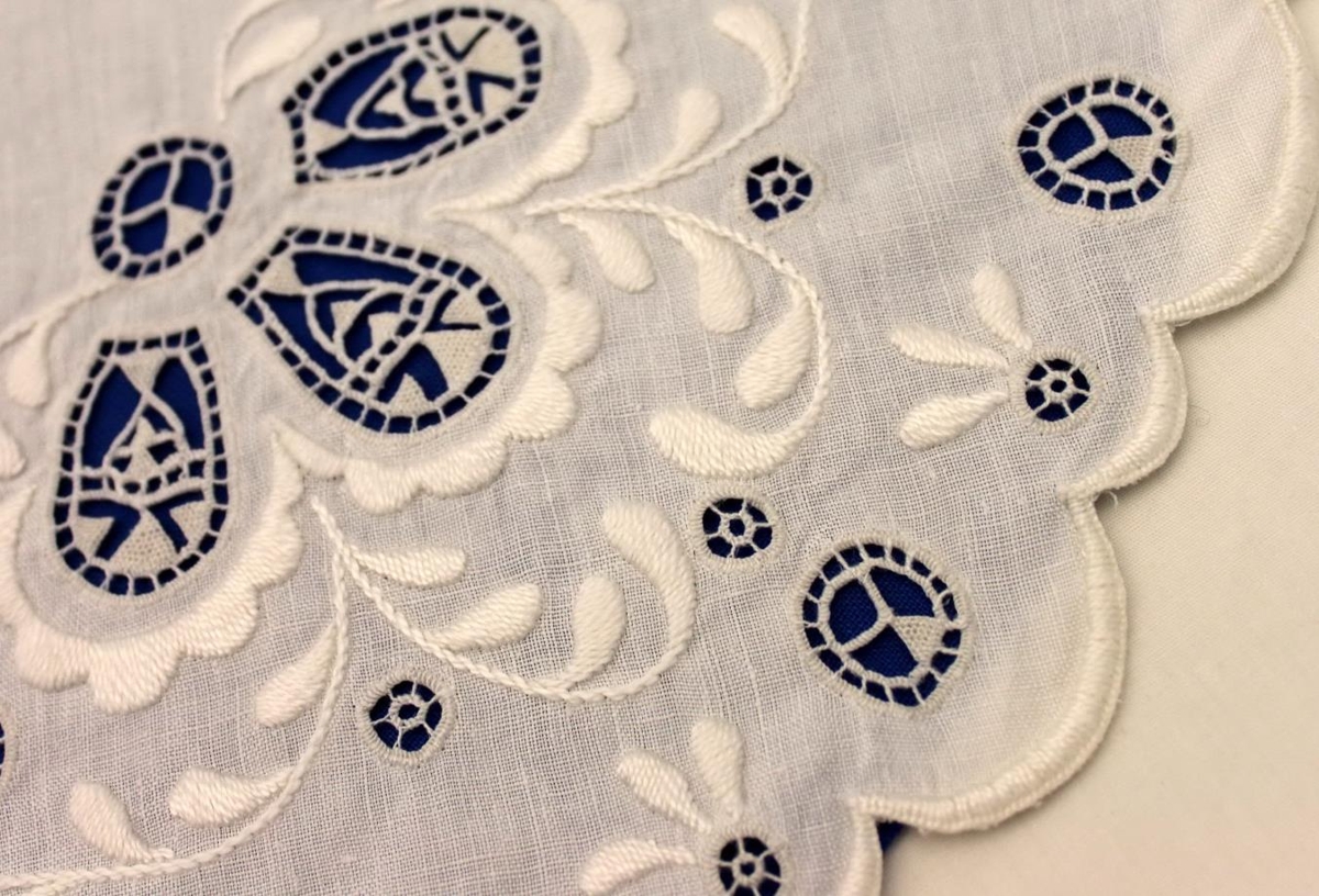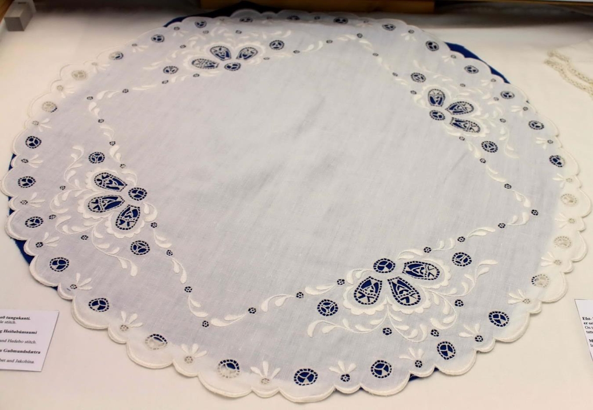 Hvítur hördúkur. Kringlóttur með tungukanti. Útsaumaður með Heiðabúasaumi (Hedebo), 4 mynstur. Allan hringinn skiptast á Hedebohringir og laufblöð með flatsaumi.