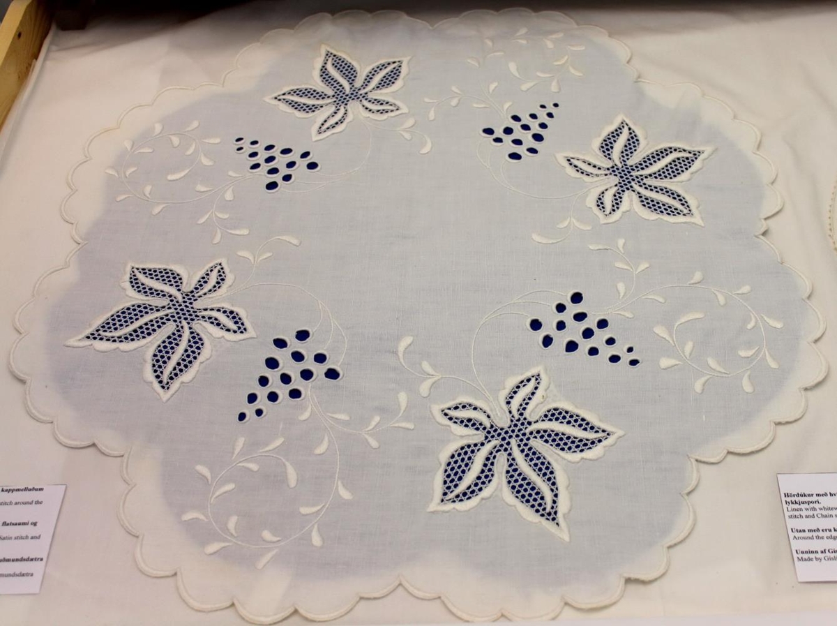 Dúkur - Kringlóttur hördúkur. Keyptir grunnar, flatsaumur, enskur saumur og kontorstingur. Kappmellaður tungukantur.