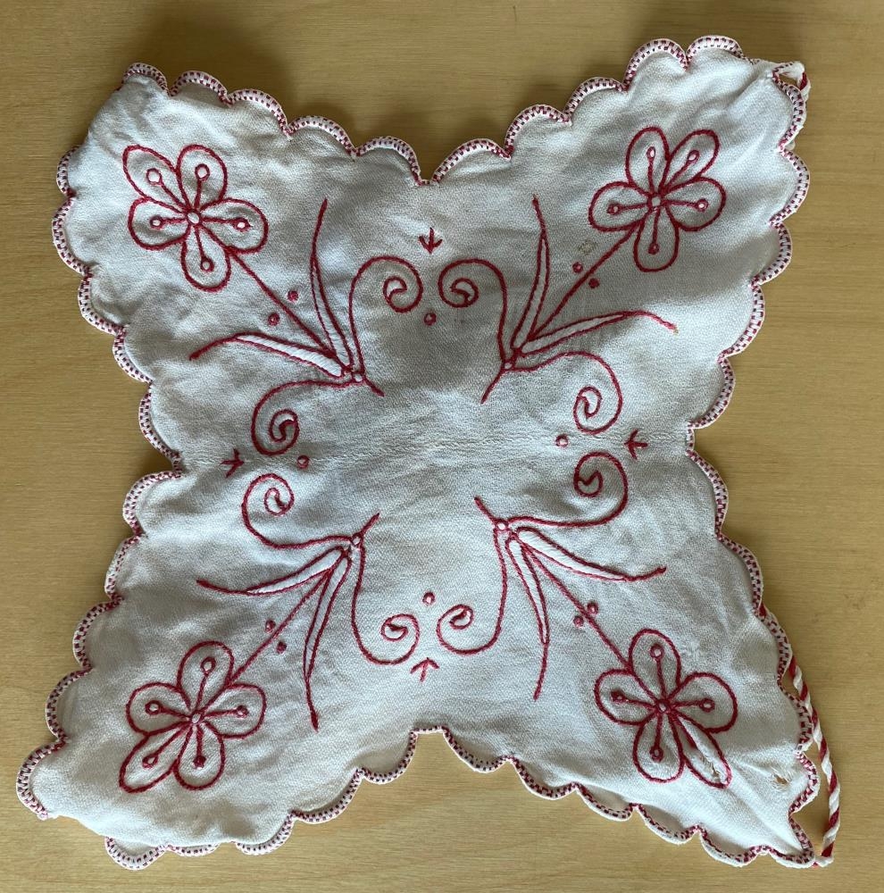 Sápuskálarhengi - Úr hvítu bómullarefni. Útsaumað með rauðu og hvítu bómullargarni. Saumað með flatsaumi og varplegg. Munstur einföld blómaker sem beinast út í hornin sem dragast út úr dúknum. Kappmellaðir tungukantar í kring með hvítu garni en tveir rauðir þræðir þræddir í. 4 snúrur mynda hengið. Hver snúra er snúin úr 2 hvítum og 1 rauðum þráðum. Snúrurnar enda á dúskum.