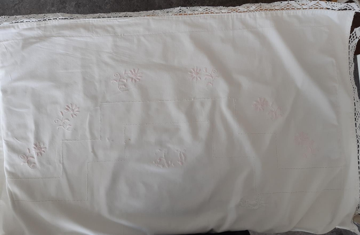 Koddaver úr hvítu lérefti. Hullfaldað munstur liggur í sikk-sakk þvert yfir en rís hæst í miðju. Í því eru einnig bleikar rósir. Keypt blúnda er saumuð á. Viðgert með sikk-sakk vélspori. Bendlar.