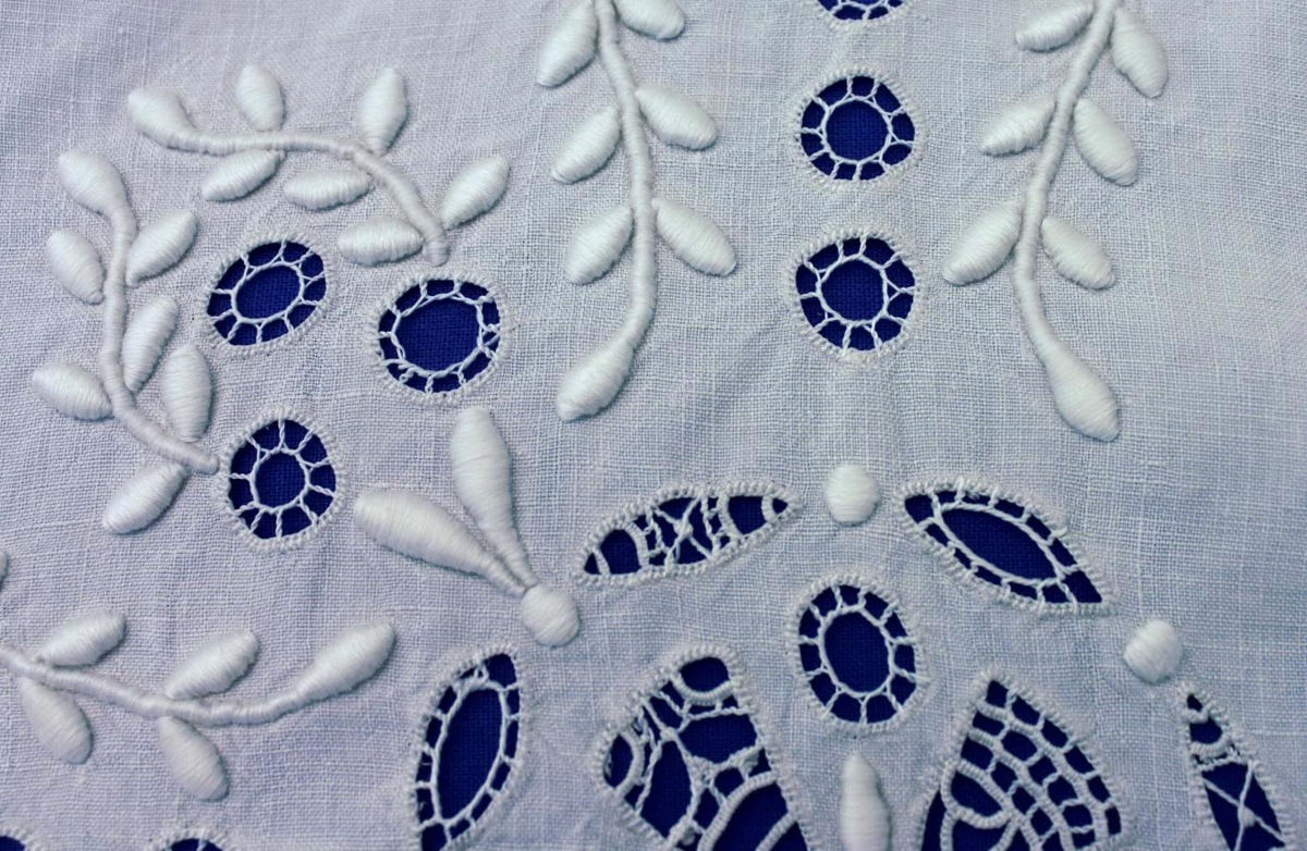 Dúkur úr fínu, hvítu hörlérefti. Saumað út með hvítu hörgarni. Saumað með Heiðabúasaumi (Hedebo) og frönskum saumi. Allur dúkurinn er með útsaumuðum tungum. Kappmelluð blúnda utan með. Fallegur dúkur.