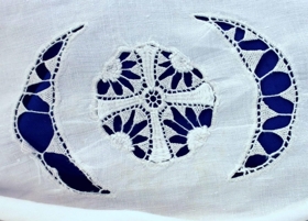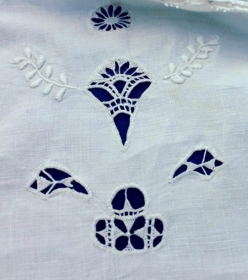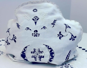 Tehetta - Hvítt hör. Útsaumuð með Heiðabúasaumi (Hedebo). Aftan á er saumað út með Heiðabúasaumi ártalið 1905. Kappmelluð blúnda er saumuð í kantinn. - Saga: Astrid Kaaber (2. maí 1884-26. júní 1928) var amma Oddnýjar Gunnarsdóttur.
