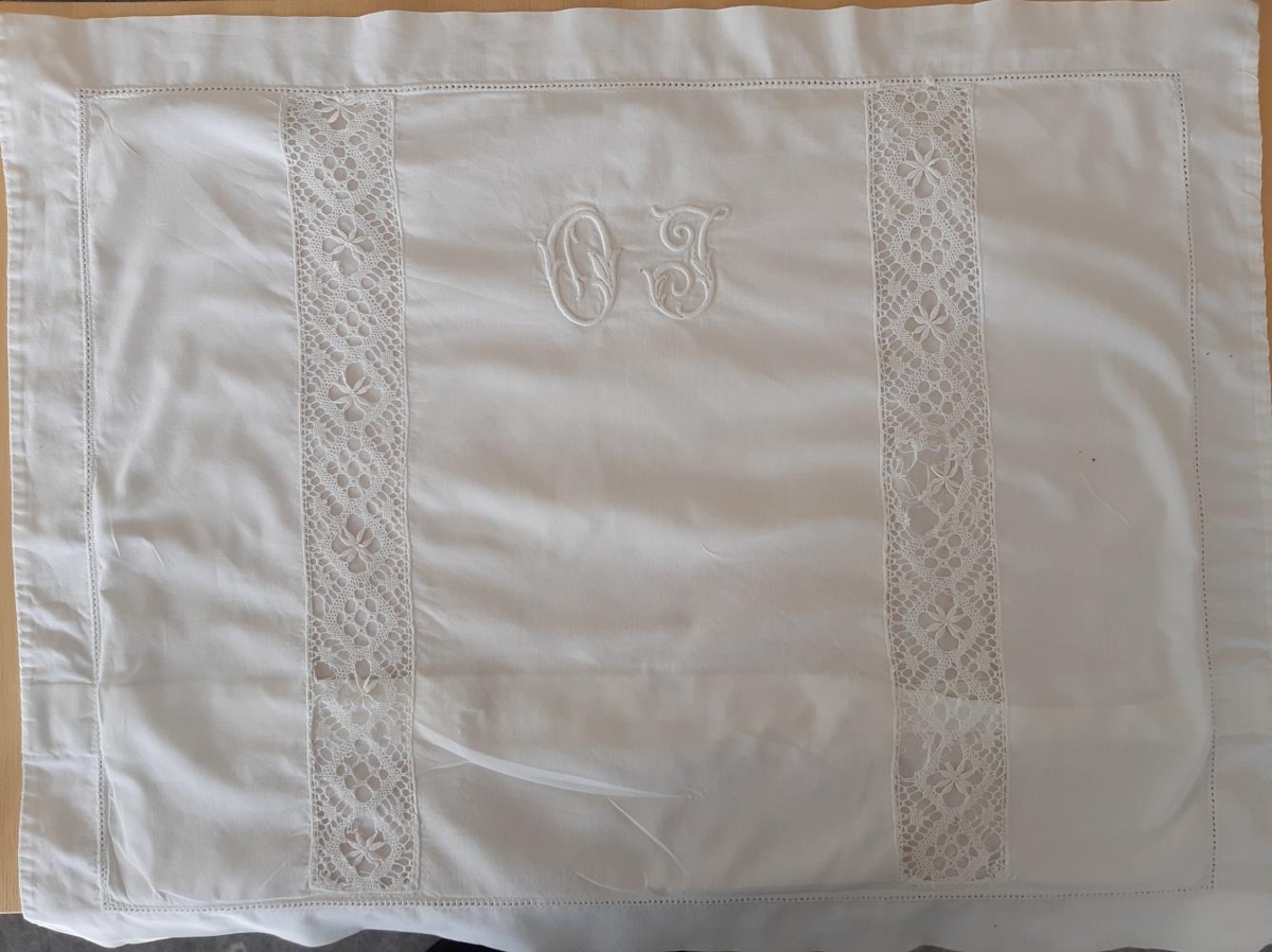 Koddaver úr hvítu lérefti. Hullfaldað í vél í kring um verið. Stafirnir 'OJ' saumaðir í miðju að ofan með frönskum saumi. Sitt hvoru megin við miðju er ísaumuð keypt blúnda.