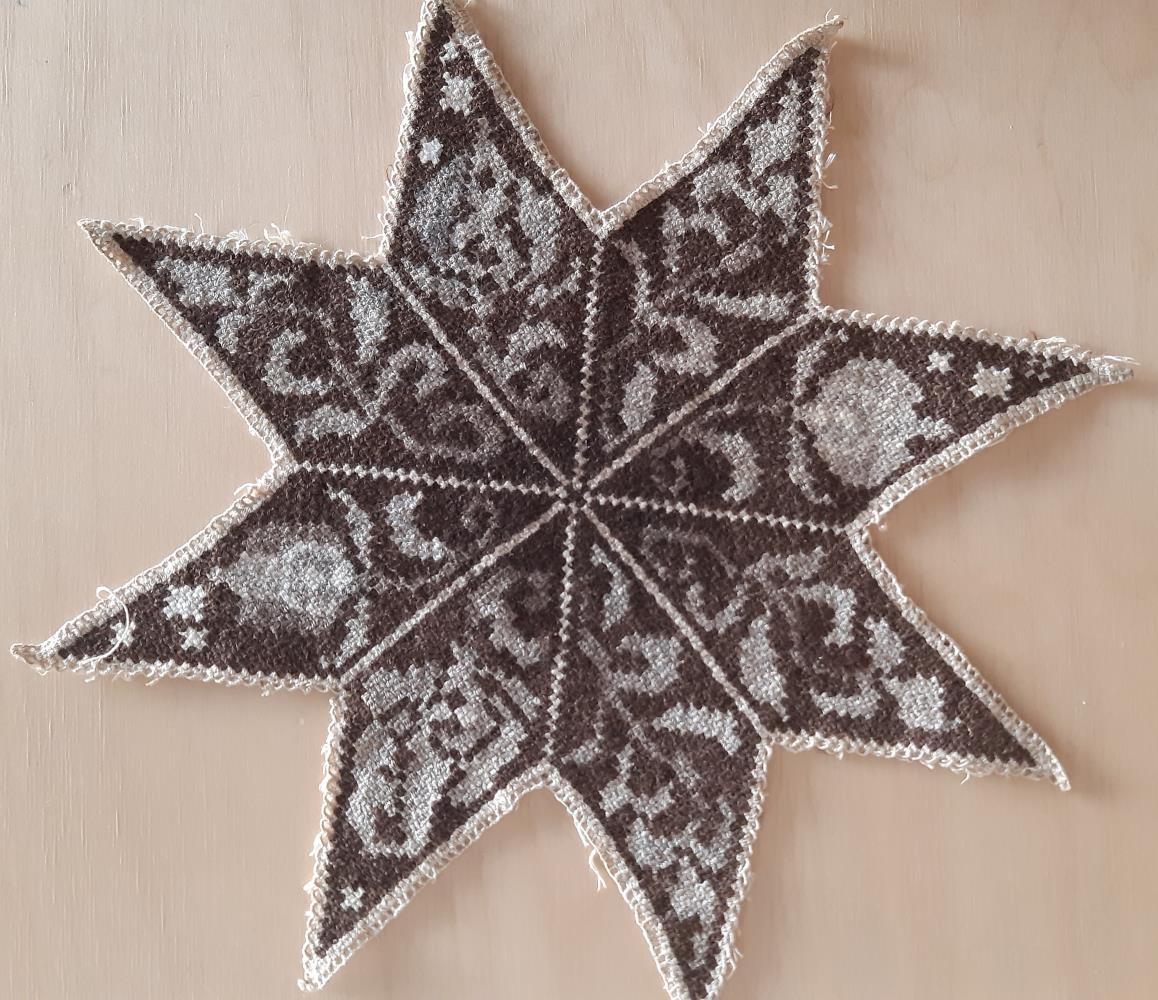 Stjörnulaga smádúkur. Fyllt upp í stramma með augnsaumi. Litir eru: brúnn, ljósbrúnn og ljósdrapp.