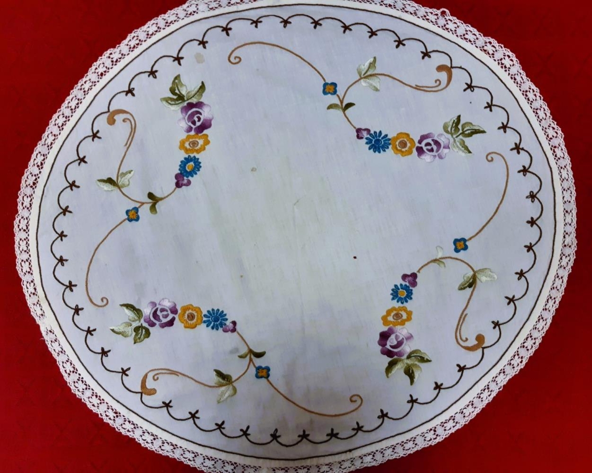 Dúkur, nánast hringlaga, 53x60 cm auk 2 cm blúndu utan með. Útsaumaður með kontorsting og mislöngum sporum. Margir litir.