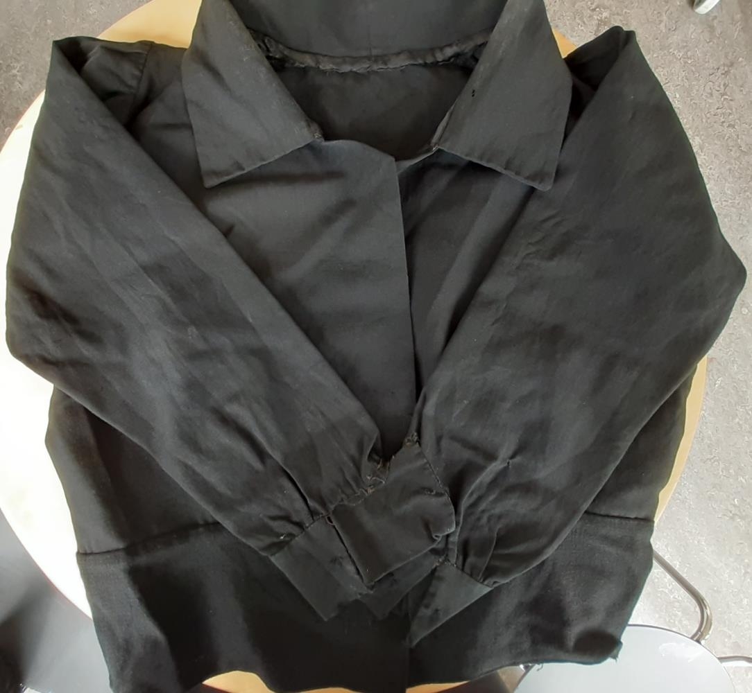 Dagtreyja saumuð úr mismunandi svörtum efnum. Í strengnum er efni sem virðist vera íslenskur dúkur.