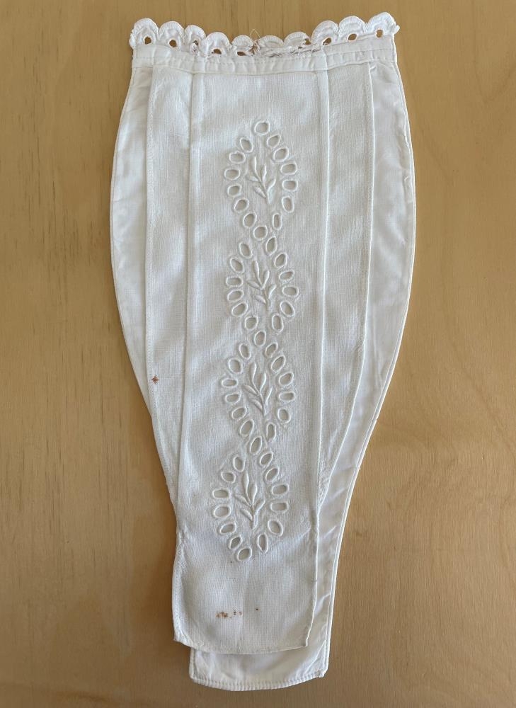 Peysubrjóst - Peysubrjóst úr hvítu lérefti saumað með enskum saumi. Efst er heimasaumuð blúnda, viðgerð.