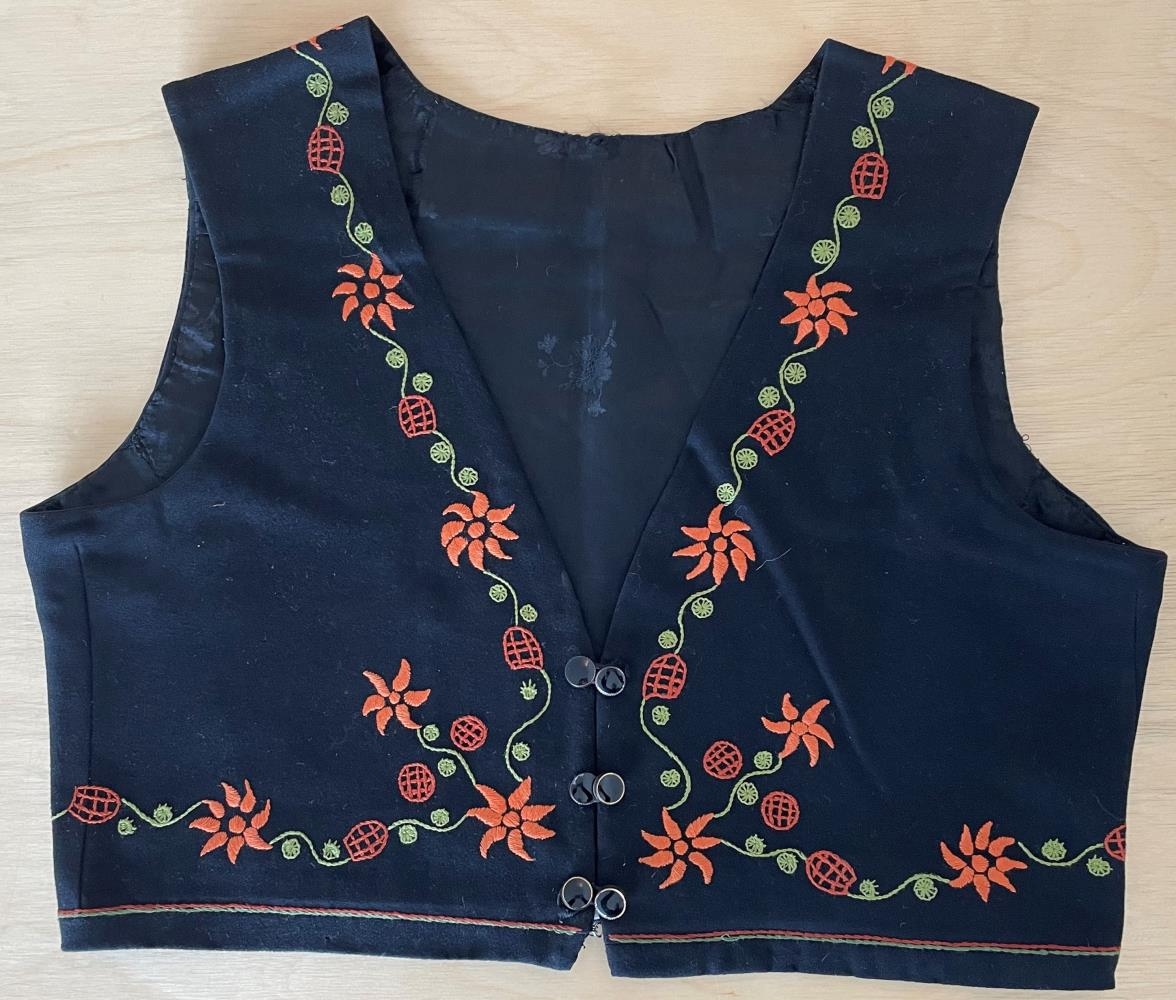 Vesti - Vesti úr svörtu klæði fóðrað með svörtu satíni. Vestið er útsaumað í kring um hálsmál, á boðungum og að neðan með kontorsting og flatsaumi. Litir eru tveir rauðbrúnir og grænn. Á vestinu eru sex tölur tvær og tvær hnepptar með teygju.