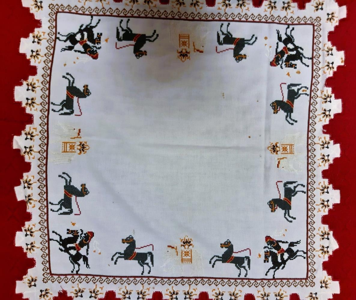 Dúkur saumaður með krosssaumi í fínan hvítan jafa. Á munstrinu eru svartir og gráir hestar, riddarar á baki í hornum og hvítir fílar. Utan með eru kappmellaðar tungur, rauðar. Einning eru gulir litir í dúknum.