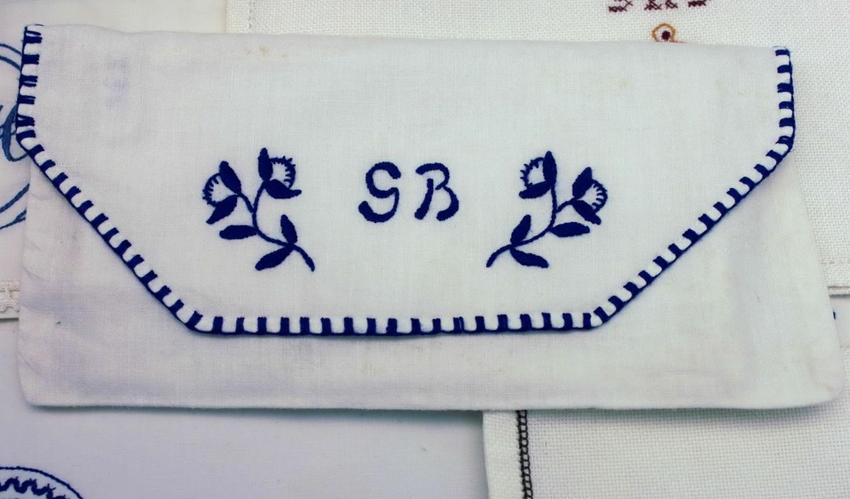 Servíettupoki - Servíettupoki úr hvítu lérefti. Saumaður með bláu aroragarni. Blóm og stafirnir G.B. - Saga: Saumaður á Kvennaskólanum á Blönduósi árið 1938.