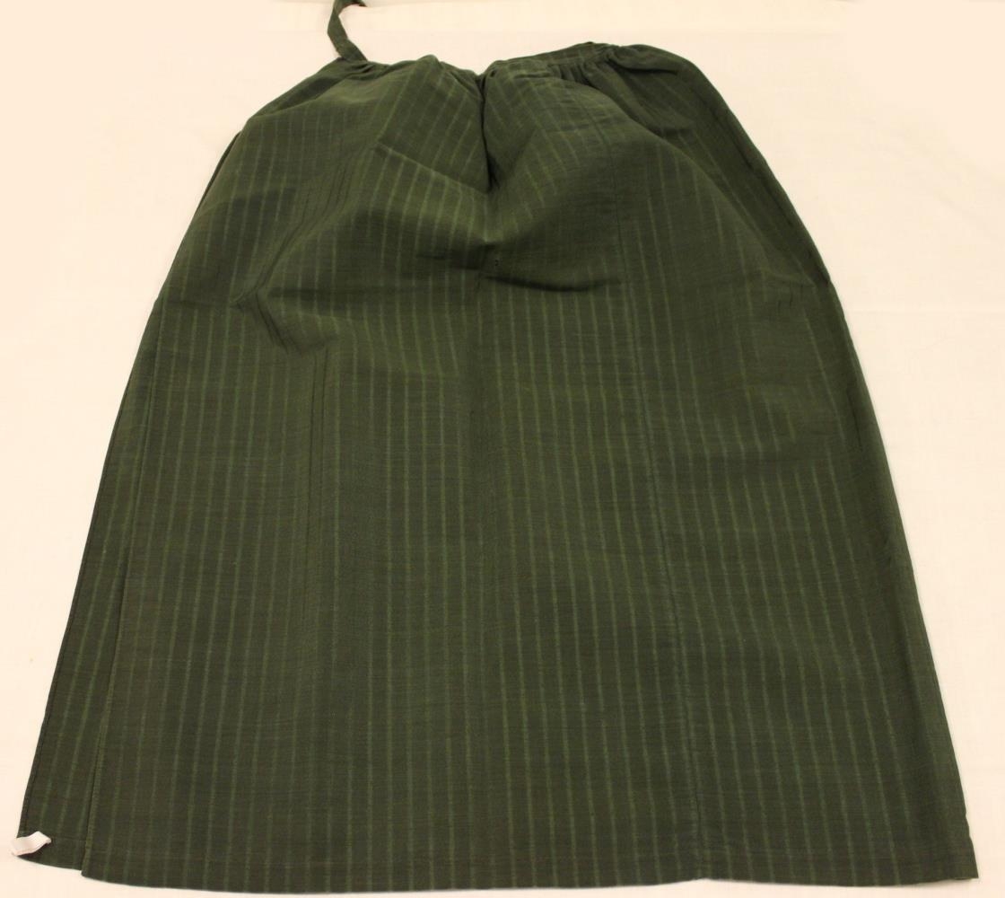 Græn svunta úr alpaka, handsaumuð. Glansrendur í tveimur aðeins dekkri litum, grænum. Svuntan er eins og hálf breidd. Felld undir streng með hnappagati og tölu. Vel farin er eins og ný.
