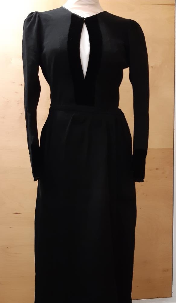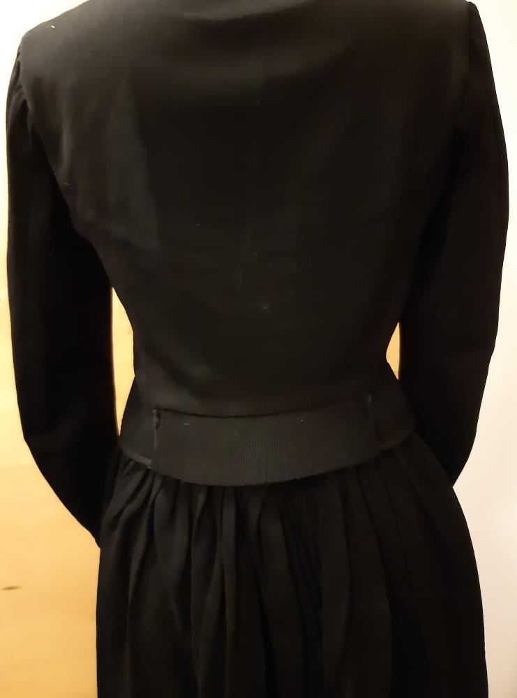 Peysa, stokkpeysa a) og pils b) úr fínu svörtu klæði. Stokkurinn á peysunni er fallegur. Flauel er á boðungum og ermum. Fóðruð með svörtum lastingi. Svartar blúndur framan á ermum.