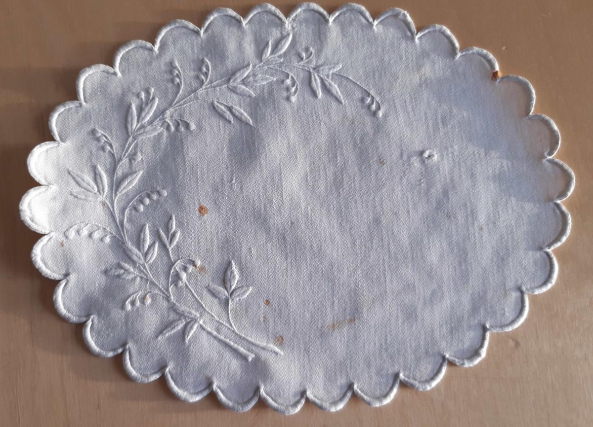 Hvítur léreftsdúkur saumaður með blaðsaumi, kontosting og flatsaumi. Utan með eru kappmelluð lauf. Á dúknum eru ryðblettir.