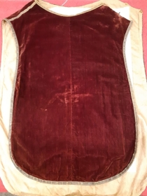 Hökull úr dökkrauðu flaueli. Aftan á er kross úr 5 cm gylltum borða. Bryddaður með sams konar borða 1 cm breiðum. Kræktur framan fyrir á annari öxlinni. Fóðraður með drapplitum lastingi.