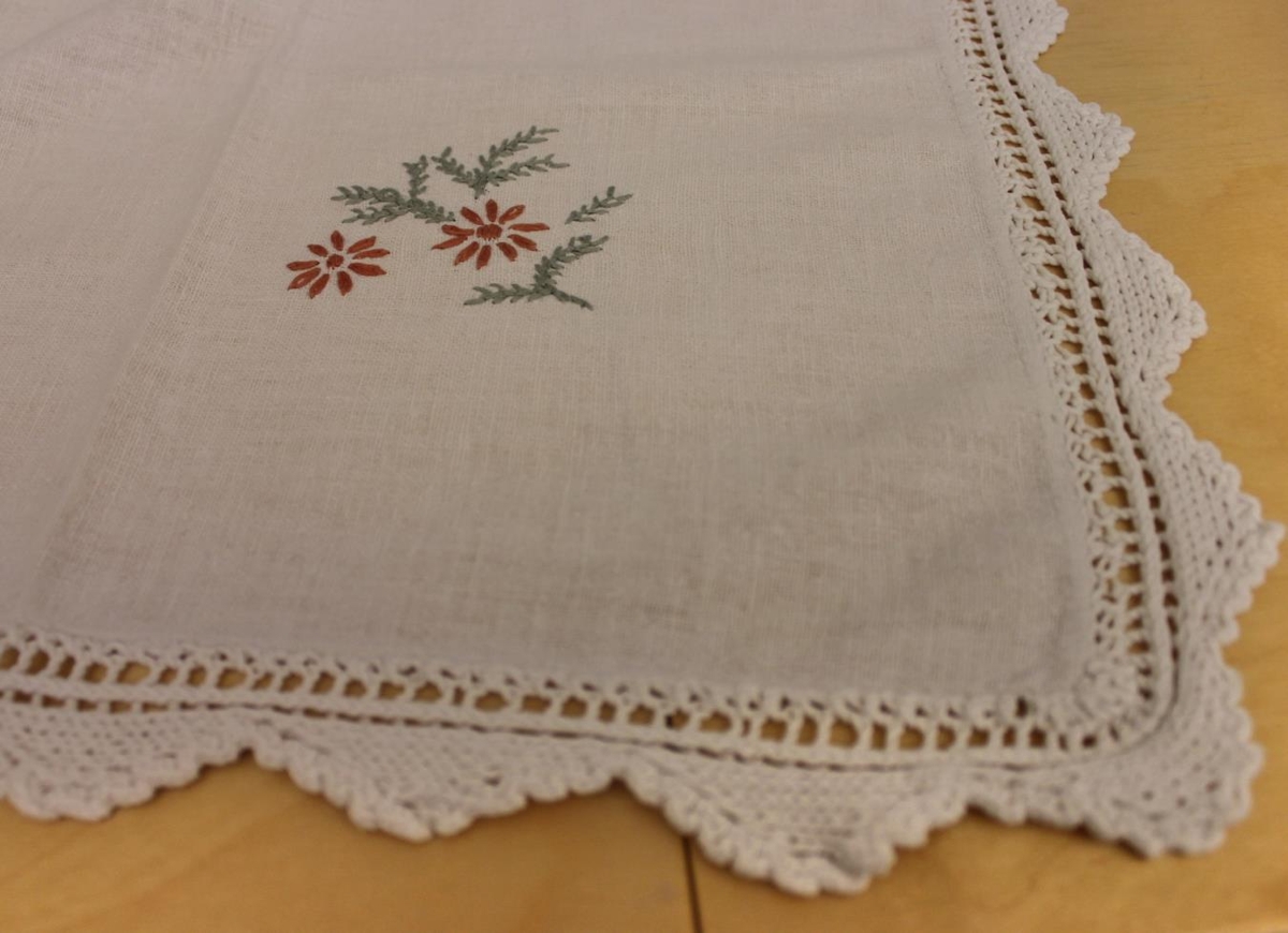 Dúkur - Hvítur dúkur saumaður úr léreftspoka. Blómahríslur á níu stöðum. Litir eru rauðbrúnn og grænn. Utan um dúkinn er blúnda prjónuð úr bómullargarni. - Saga: Úr eigu Signýjar Benediktsdóttur Balaskarði móður gefenda. Jóhanna Ísleifsdóttir og Signý voru miklar vinkonur. Jóhanna kom oft í Balaskarð og stoppaði lengi.