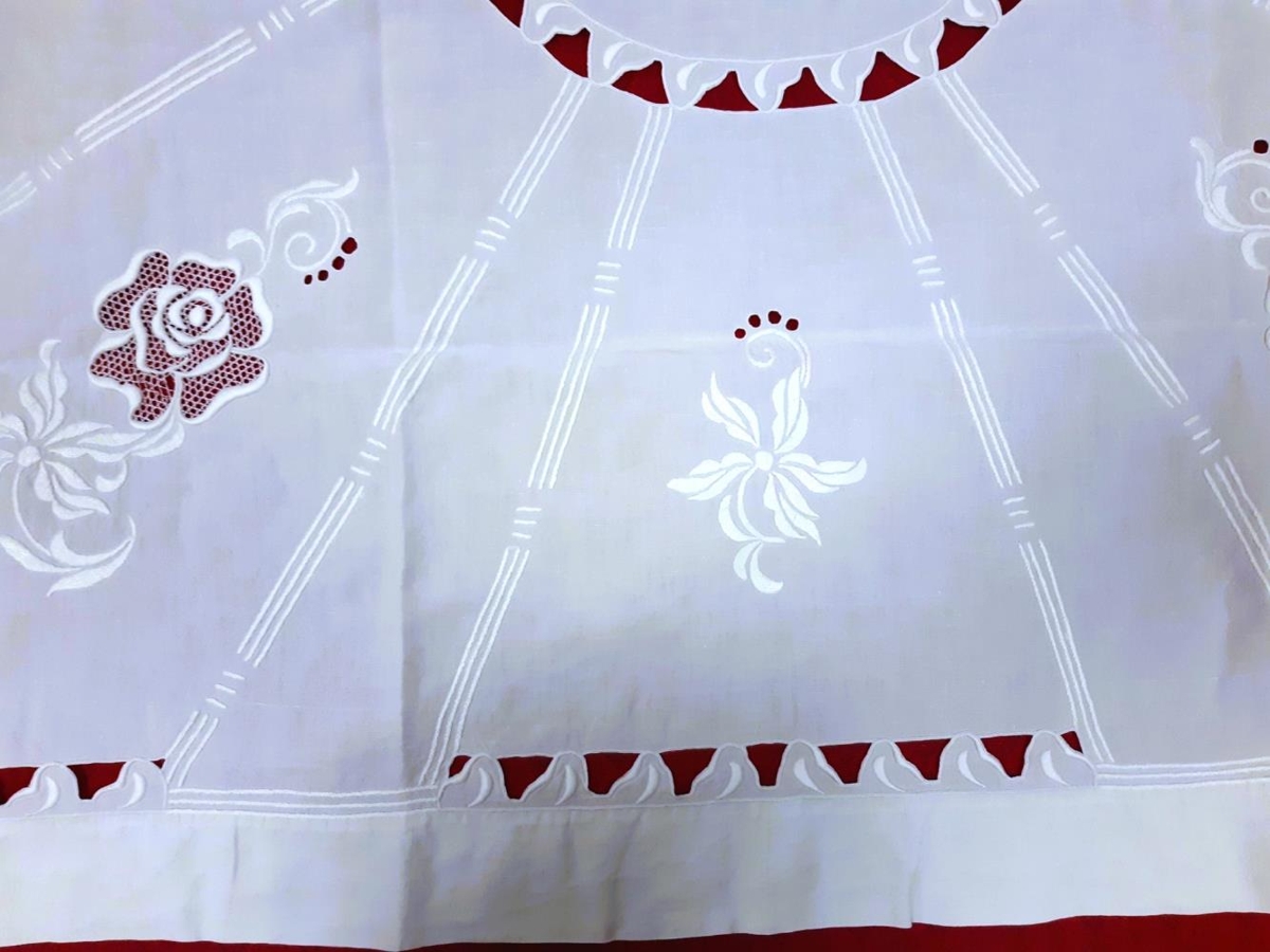 Kaffidúkur úr hör. Venesienskur hringur í miðju, flatsaumur, kontorsaumur út frá miðju og venesienskut kantur að neðan að hluta, flatsaumur/kontorstingur að hluta