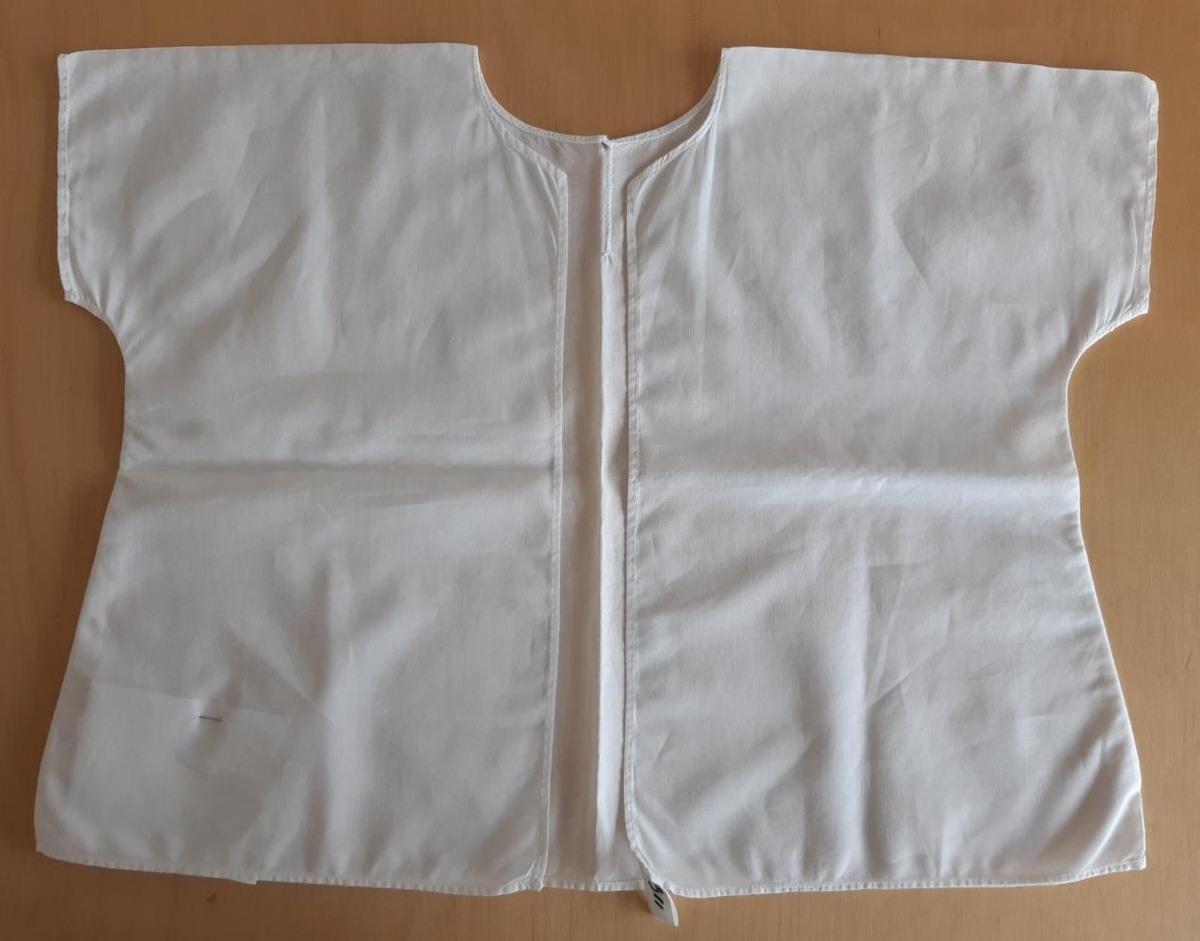 Skyrta - Ungbarnaskyrta. Undurfín hvítt bómullarléreft (silkiléreft). Virðist hafa rifnað að framan og rifunni varpað saman.
