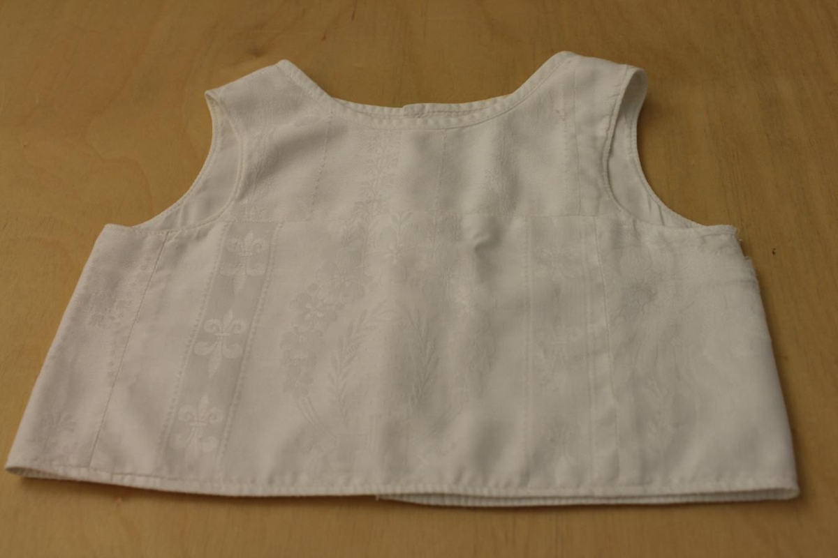 Ungbarnakot/skyrta - Lítið kot/skyrta saumuð úr afgöngum af hvítu damaskefni. Hneppt að aftan með þremur tölum. - Saga: Saumaður áður en Gunnhildur fæddist 17.10.´45 af móður hennar, Unni Þórðardóttur. Sjá bláu möppu