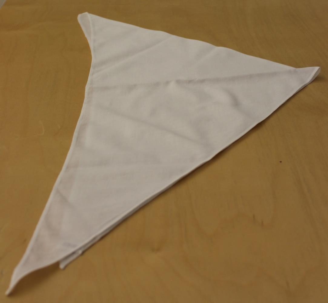 Ungbarnahyrna - Úr hvítu undurfínu bómullarlérefti. Þríhyrna sem trúlega var vafin utan um brjóst barna. - Saga: Saumaður áður en Gunnhildur fæddist 17.10.´45 af móður hennar, Unni Þórðardóttur.