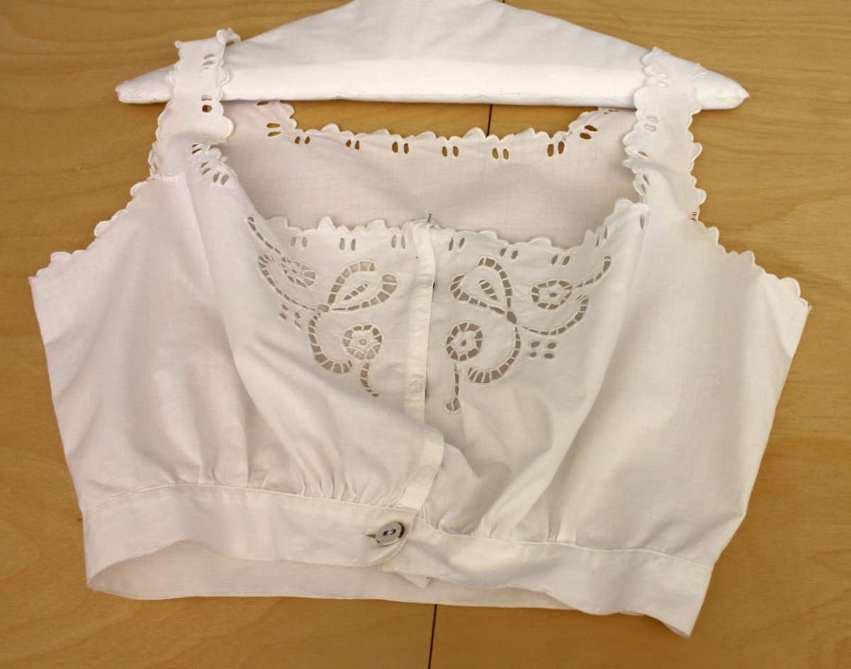 Kot - Hvítt léreft. Í hálsmáli og ermaopum er kantað með tungukanti, handsaumuðum. Við brúnir eru saumuð aflöng göt í pörum með enskum holum. Á brjósti er mikið munstur saumað í venesienskum saum. Smellt framan með þremur smellum og einni léreftstölu í mittið. Hlýri á hægri öxl, viðgerður. - Saga: Úr eigu ömmu Gunnhildar, Ástu Maríu Einarsdóttur, f. 1900 d. 1981. Líklega frá systur hennar, Sigurbjörgu Einarsdóttur því þetta er merkt S.E. Sjá bláu möppu