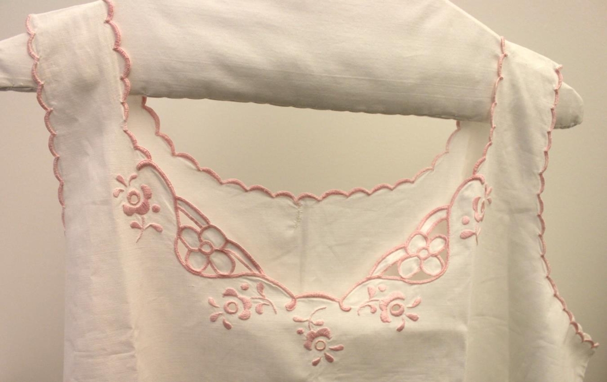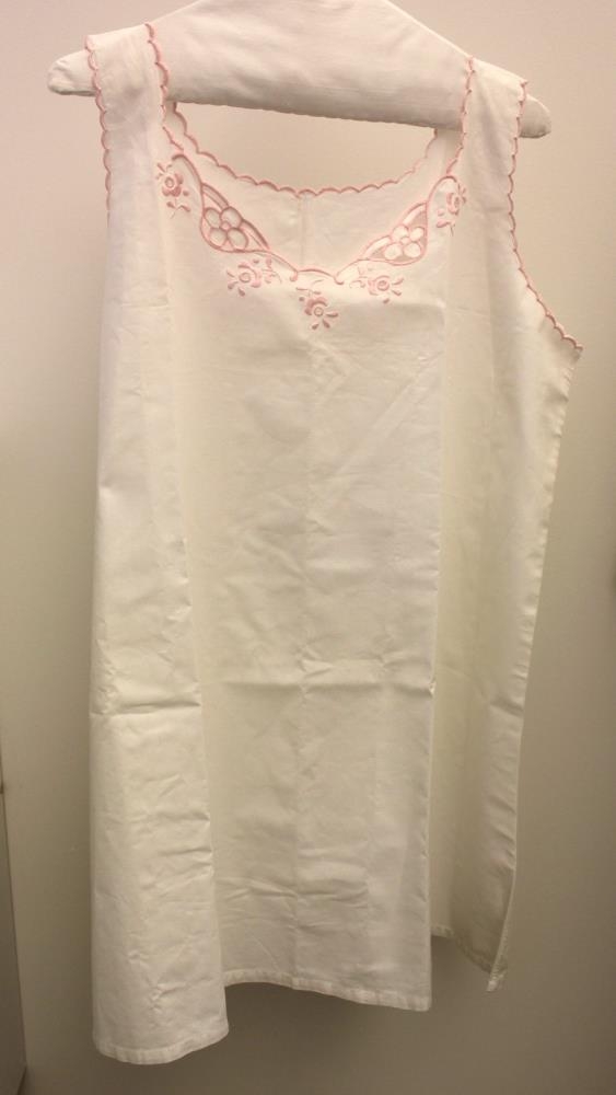 Undirserkur/Náttserk - Síður serkur úr hvitu lérefti. Faldaður að neðan en útsaumaður í hálsi og ermaopum með tungukanti. Venisiönsk blóm í hálsmálið að framan. Að auki er blómamunstur við hálsmál með flatsaum. - Saga: Algengt var að láta stúlkur sauma sér svona sett fyrir fermingu. Þetta gerði Ragnheiður. Sjá bláu möppu