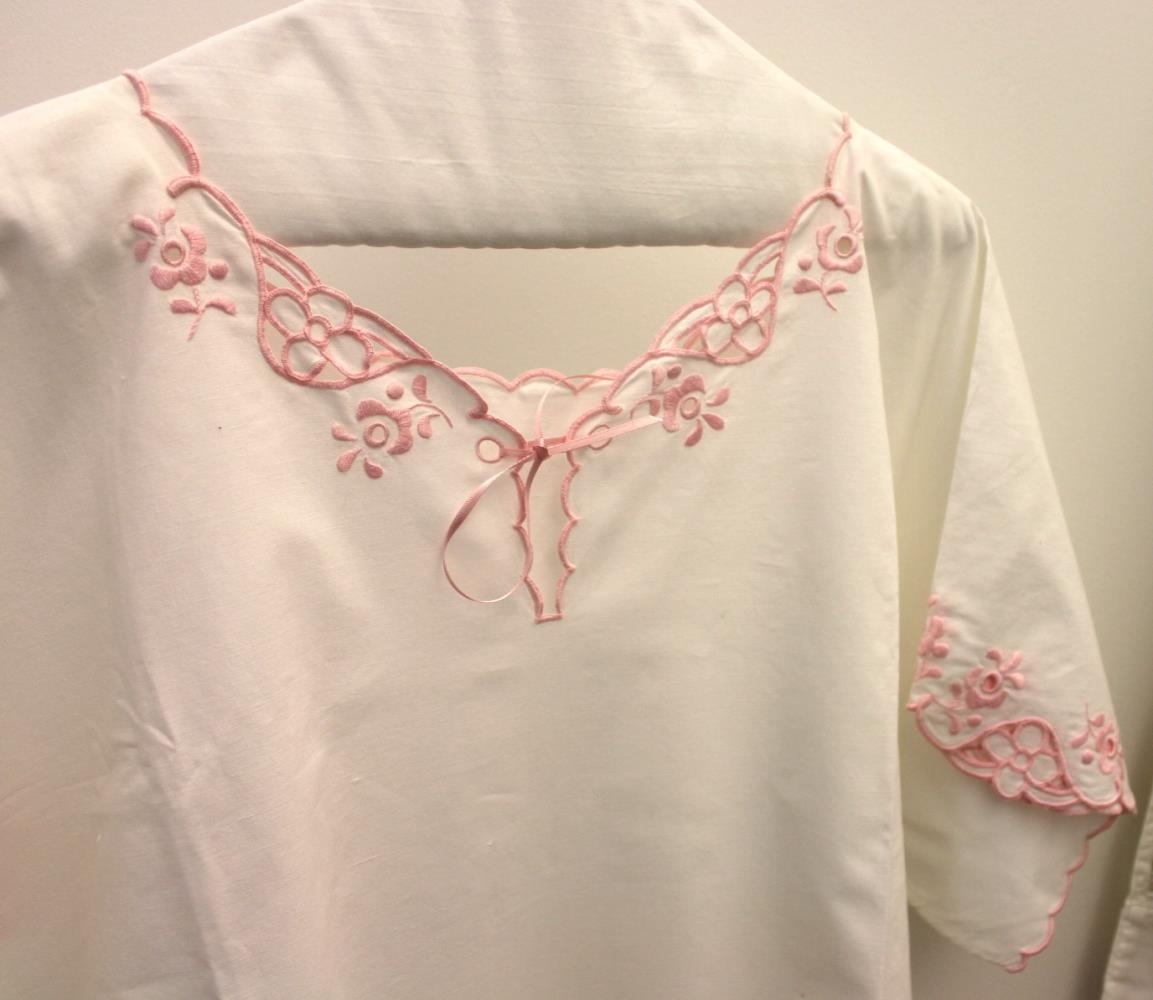 Náttkjóll - Hvítt bómullarléreft. Faldaður að neðan. Viðauki í báðum hliðum að neðan. Saumað út með bleiku bómullargarni. Venisenskur útsaumur á ermum og í hálsmáli og saumað út með flatsaum og enskum saum fyrir ofan/neðan hálsmál og ermar. Hnýtt saman með bleikum skilkiborða - Saga: Algengt var að láta stúlkur sauma sér svona sett fyrir fermingu. Þetta gerði Ragnheiður. Sjá bláu möppu